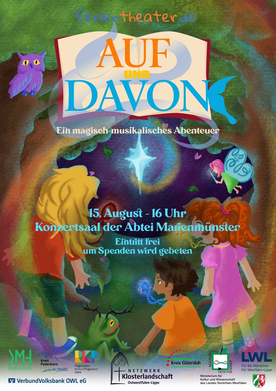 Im Ferientheater 2025 haben wir gemeinsam mit den teilnehmenden Kindern und Jugendlichen das magische Musical AUF und DAVON erarbeitet. Zunächst wurde im Rahmen eines Vorbereitungsworkshops im März gemeinsam eine Geschichte herausgearbeitet, welche schließlich in Richtung einer magischen Reise in eine Fantasiewelt ging.